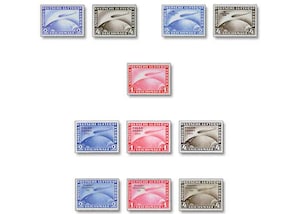 Die Flugpostmarken zu 2 und 4 Reichsmark sowie ein Ergänzungswert dokumentieren mit ihren wechselnden Aufdrucken von 1928 bis 1933 die imposanten Streckenleistungen des legendären Luftschiffs LZ 127. Sie erhalten das weltweit stark nachgefragte Komplett-Set mit allen 11 Ausgaben als wertvollste Erhaltung postfrisch in geprüfter Premium-Qualität.