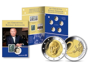 Mit der 2-Euro-Gedenkmünze "Konrad Adenauer", Prägung aus allen 5 deutschen Prägestätten (Stempelglanz) sowie 4 passenden Briefmarken (Bund, 1968-2005, postfrisch).