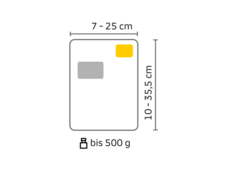 - Inhaltsbeispiele: Magazine, Broschüren, Kataloge, Grußkarte im quadratischen Umschlag, Verträge oder größere Dokumentensätze bis 500 g.