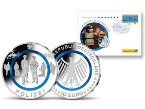 Mit der gleichnamigen 10-Euro-Gedenkmünze (st) und der Sondermarke "Polizisten des Bundes und der Länder" (Bund, 2019) mit Sonderstempel vom Ausgabetag der Münze.